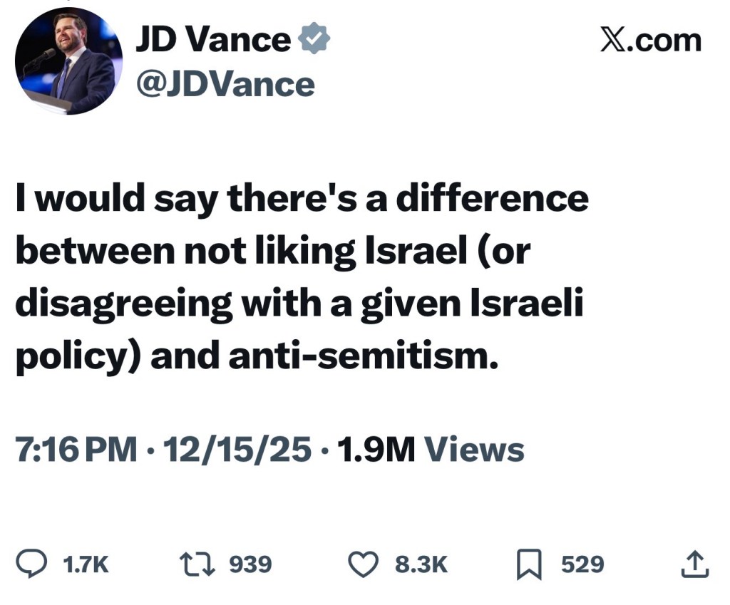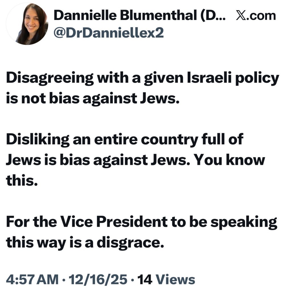 So this is how Jew hatred becomes okay. JD Vance says, it’s okay to dislike Israel, not dislike Israel’s policies, dislike Israel, AKA Jews. After the Bondi Beach attack, unfortunately, Tucker Carlson’s not so bright brother, Buckley, said that Arson Ostrovsky, one of the victims, a prominent human rights lawyer from Israel, was actually an Israeli agent, part of an Israeli false flag. Then he walked it back later saying he didn’t say that the man is a crisis actor, but Twitter is full of the vile garbage that he was spewing. It doesn’t end there. Now people have picked up on that and Twitter’s full of it.
