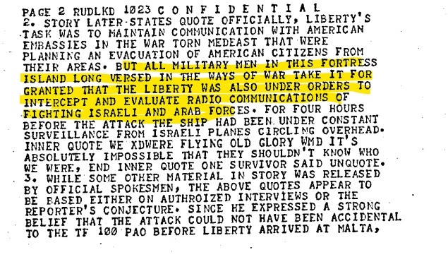 Beyond just confirming the intelligence mission, the text details the ship’s sophisticated technical capabilities, describing it as a vessel “loaded with electronic equipment” for the rapid acquisition and transmission of intelligence data. The reports also underscore the controversy surrounding the attack itself; one survivor is quoted as saying it was “absolutely impossible” for the attackers not to know the ship’s identity, especially since it was flying the American flag (“Old Glory”) and had been under constant surveillance by Israeli planes for four hours leading up to the strike. These documents suggest a significant gap between the ship’s public “noncombat” status and its actual role as a high-level signals intelligence platform.