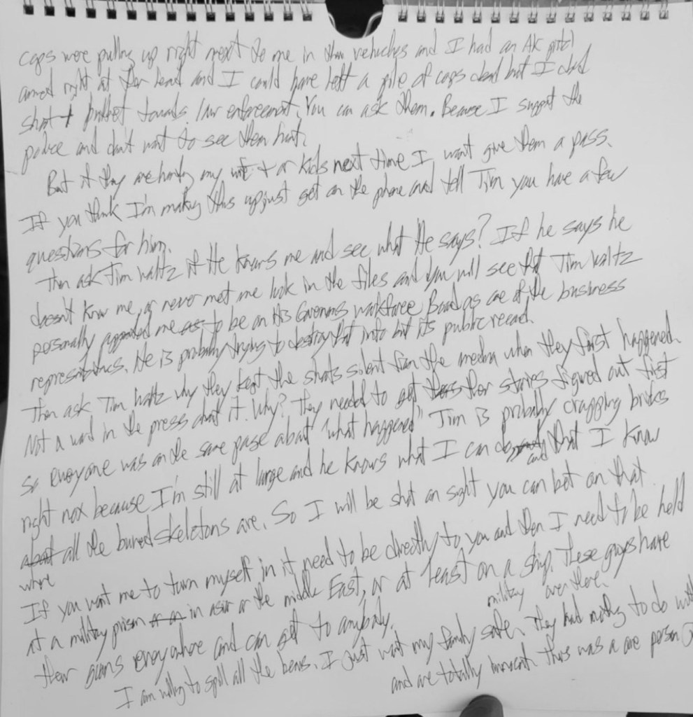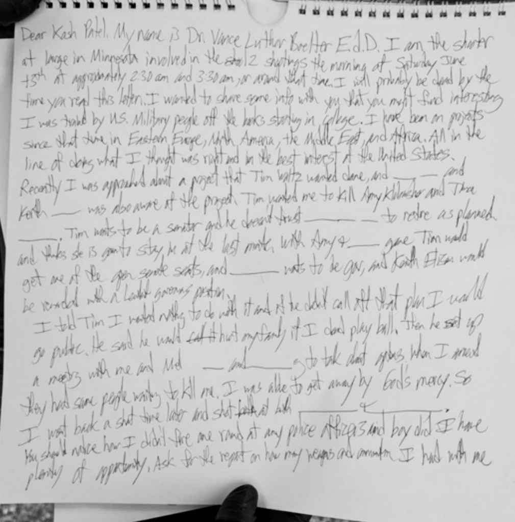 My name is Dr. Vince Luther Boelter Ed.D. I am the shooter at large in Minnesota involved in the [illegible] shootings the morning of Saturday June 13th at approximately 2:30am and 3:30am, in around [unclear] that I will probably be dead by the time you read this letter.