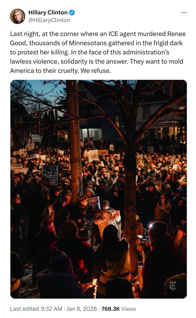 “Last night, at the corner where an ICE agent murdered Renee Good, thousands of Minnesotans gathered in the frigid dark to protest her killing. In the face of this administration’s lawless violence, solidarity is the answer. They want to mold America to their cruelty. We refuse.”
