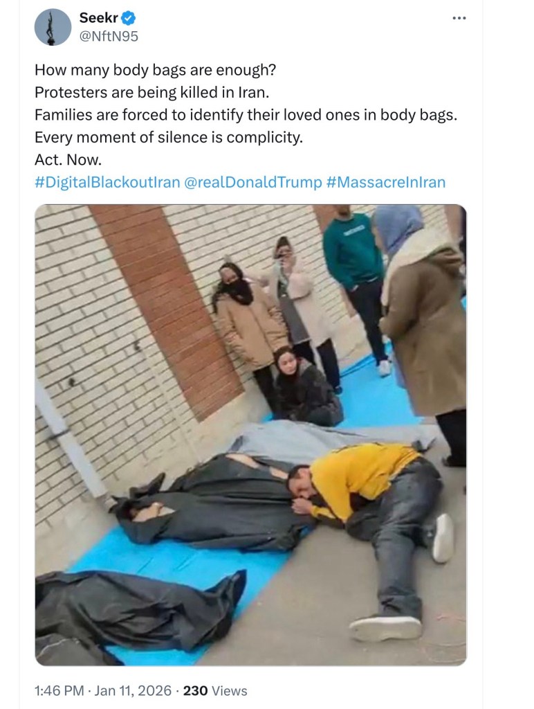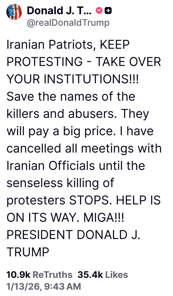 Yesterday President Trump issued a post on Truth Social warning Iran “will pay a big price” for the “senseless killing of protesters.” https://truthsocial.com/users/realDonaldTrump/statuses/115888317758045915