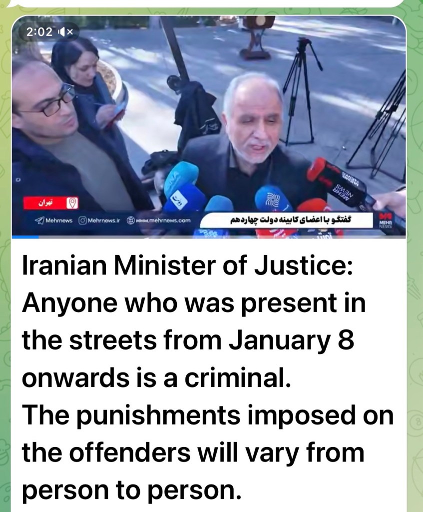 On approximately January 14, 2026 (it may have been a day or two before), Iranian Minister of Justice Amin Hossein Rahimi told reporters that “terrorists” were agitating from the outside, escalating an economic issue for their own purposes.