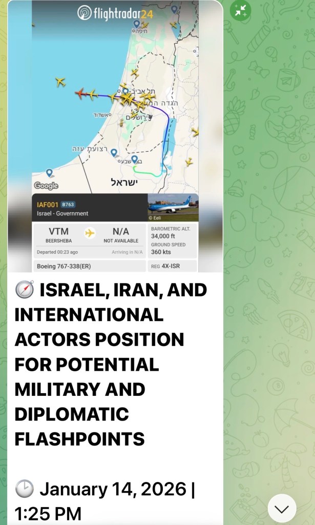 This morning, Israel Realtime Digest on Telegram reports: “U.S.-LED MILITARY OPTIONS AND DIPLOMATIC SIGNALING TOWARD IRAN ENTER ACTIVE PLANNING PHASE.” https://t.me/Israel_Realtime_Digest/40450