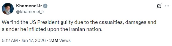 - 5:12 AM: Khamenei’s first tweet accuses Trump of guilt for “casualties, damages, and slander” against Iran.