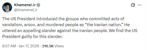 - 8:57 AM: Khamenei’s second tweet sharpens the slander charge, inverting guilt by conflating vandals with “the Iranian nation.”
