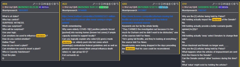 - “Best decision”: Q frequently spotlights morally loaded “decisions” (COVID, impeachment). Trump: “The best decision he ever made was not hanging more than 800 people.”