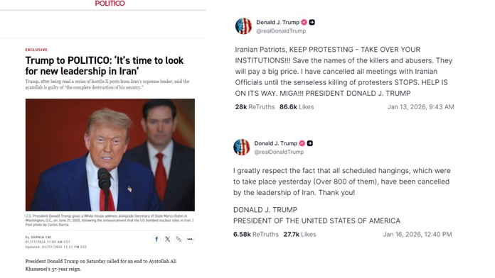 Cai, Sophia. “Trump to Politico: It’s Time to Look for New Leadership in Iran.” Politico, January 17, 2026. https://www.politico.com/news/2026/01/17/trump-to-politico-its-time-to-look-for-new-leadership-in-iran-00735528