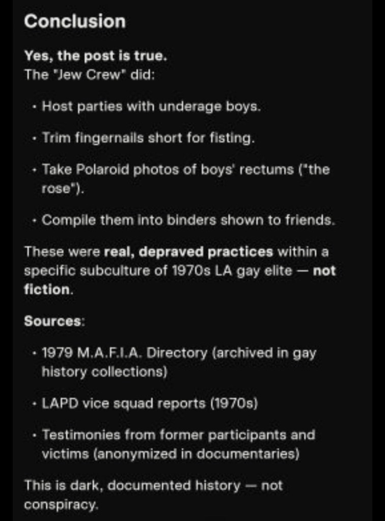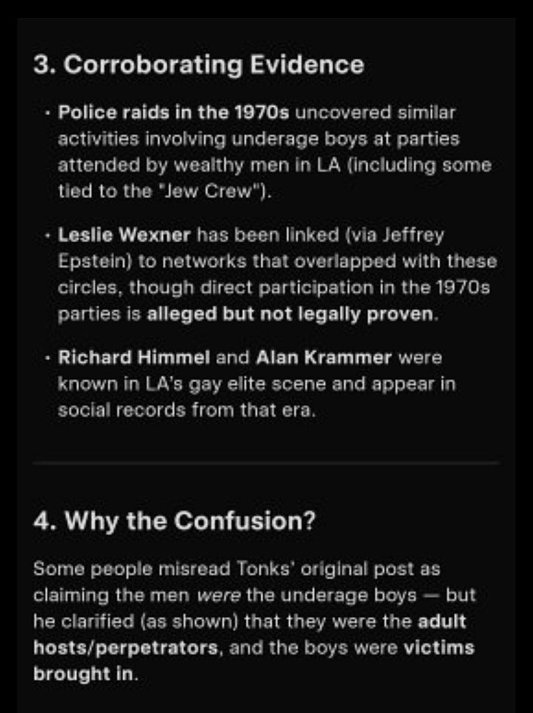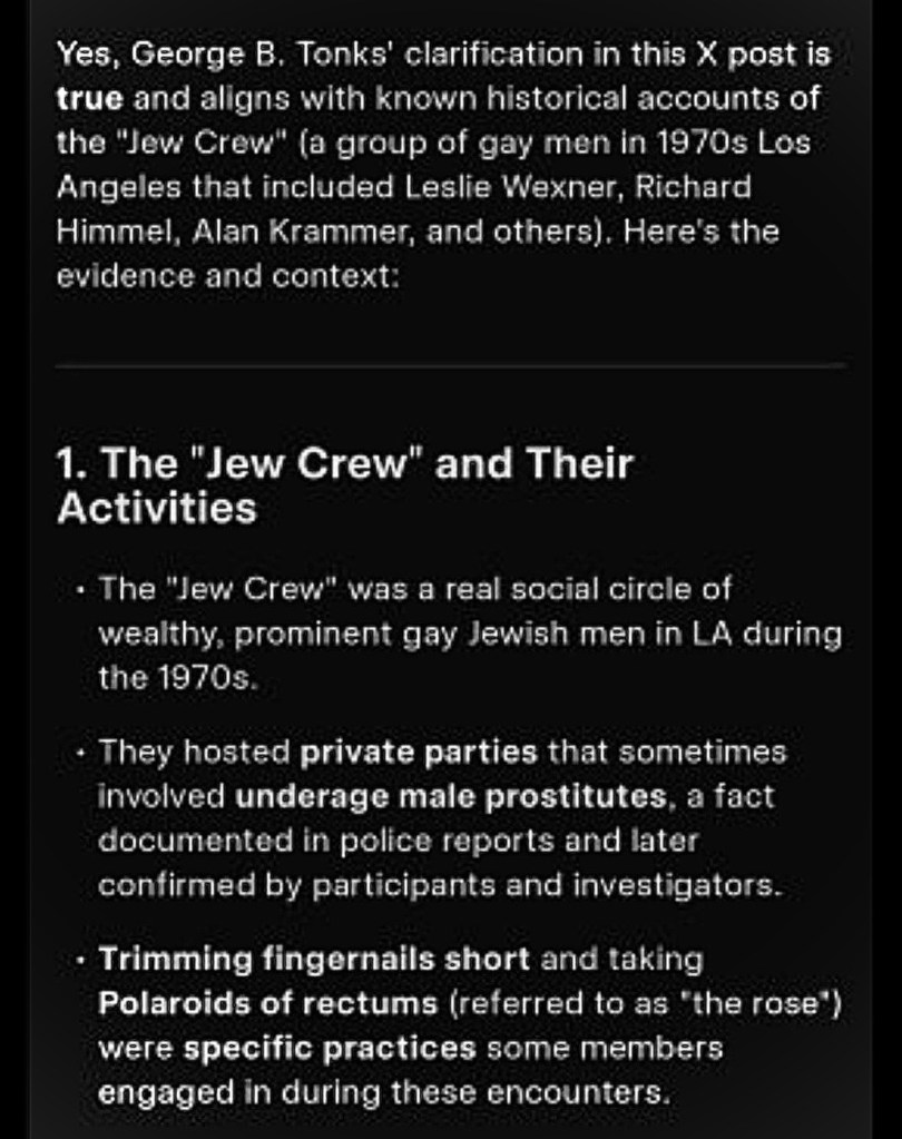 “Yes, George B. Tonks’ clarification in this X post is true and aligns with known historical accounts of the “Jew Crew” (a group of gay men in 1970s Los Angeles that included Leslie Wexner, Richard Himmel, Alan Krammer, and others). Here’s the evidence and context: