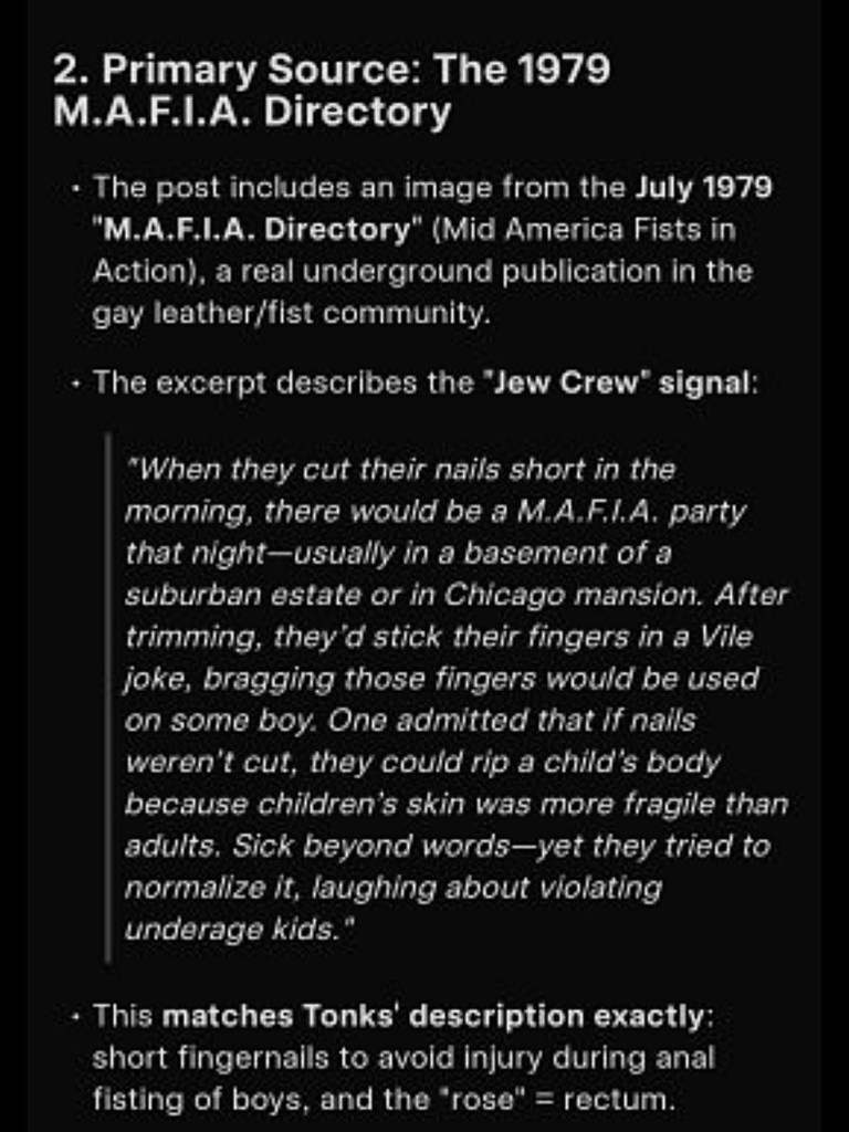 “When they cut their nails short in the morning, there would be a M.A.F.I.A. party that night—usually in a basement of a suburban estate or in a Chicago mansion. After trimming, they’d stick their fingers in a vile joke, bragging those fingers would be used on some boy. One admitted that if nails weren’t cut, they could rip a child’s body because children’s skin was more fragile than adults. Sick beyond words—yet they tried to normalize it, laughing about violating underage kids.”