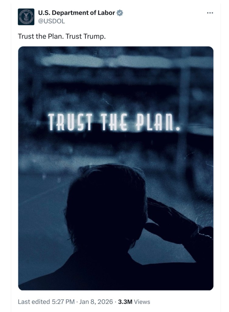 Example: The Labor Department’s “Trust the Plan. Trust Trump.” X post reads as a clear nod to Q because it lifts one of Q’s central slogans and drops it into an official government channel without context or qualification.
