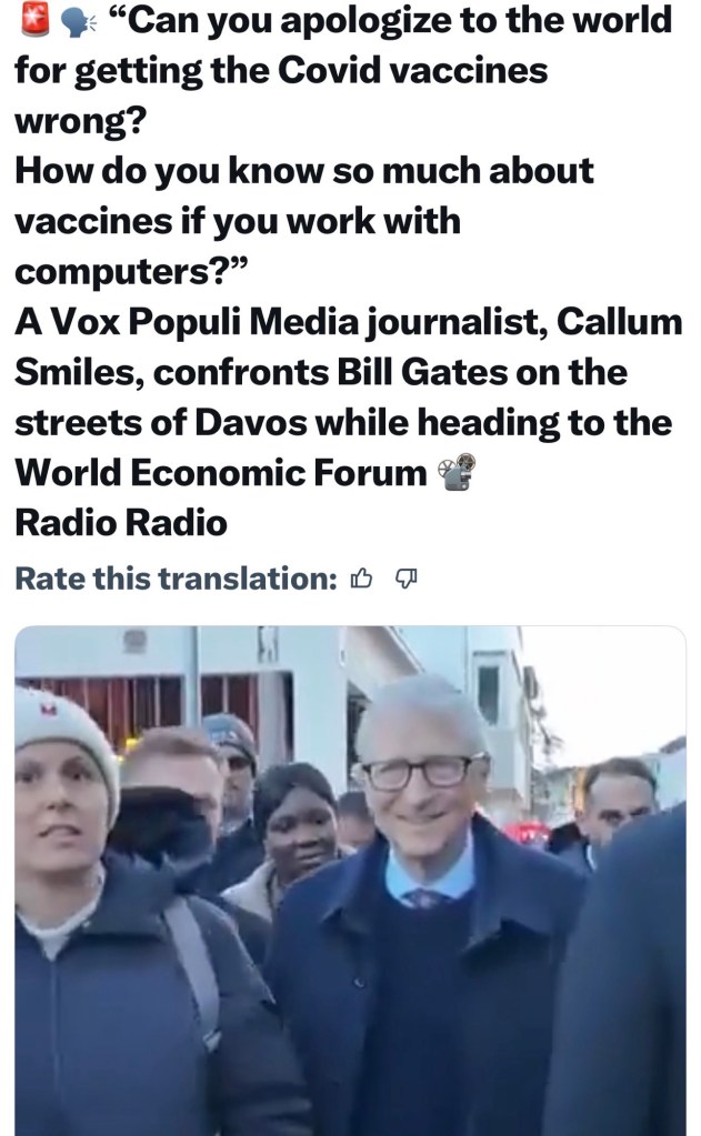 So I caught a couple of citizen interviews at the World Economic Forum where ordinary people were talking to dignitaries. And the one thing that struck me was their incredible, incredible arrogance. I was nauseous watching this stuff. These people wield so much power over our lives in indirect ways and they don’t feel any compulsion to answer for their actions. It’s truthfully disgusting. And especially the actions of Bill Gates. Who does he think he is? His actions in promoting the COVID vaccine and how many people died and he’s scoffing? Come on.