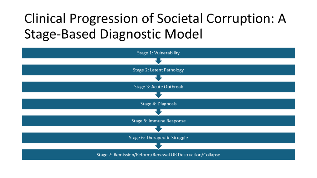 The present framework represents a synthesis of these intellectual lineages into a new analytical structure: a clinical progression model of societal disease that tracks corruption from predisposing vulnerabilities through latent pathology, acute outbreak, diagnosis, immune response, therapeutic struggle, and either remission or collapse. Its originality lies not in the metaphor itself, but in its formalization as a diagnostic system capable of comparative and longitudinal analysis.