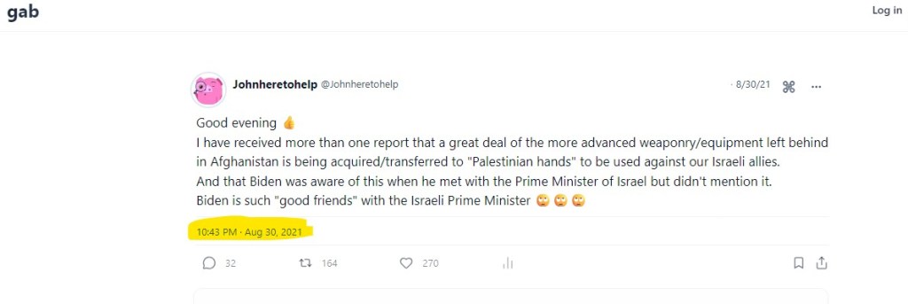 768 days before October 7, Dr. Jon McGreevy (aka Ryan Dark White aka JohnHeretoHelp) said: Biden administration purposely left equipment in Afghanistan for transfer to Palestinians to attack Israel. Biden knew this and did not tell @netanyahu.