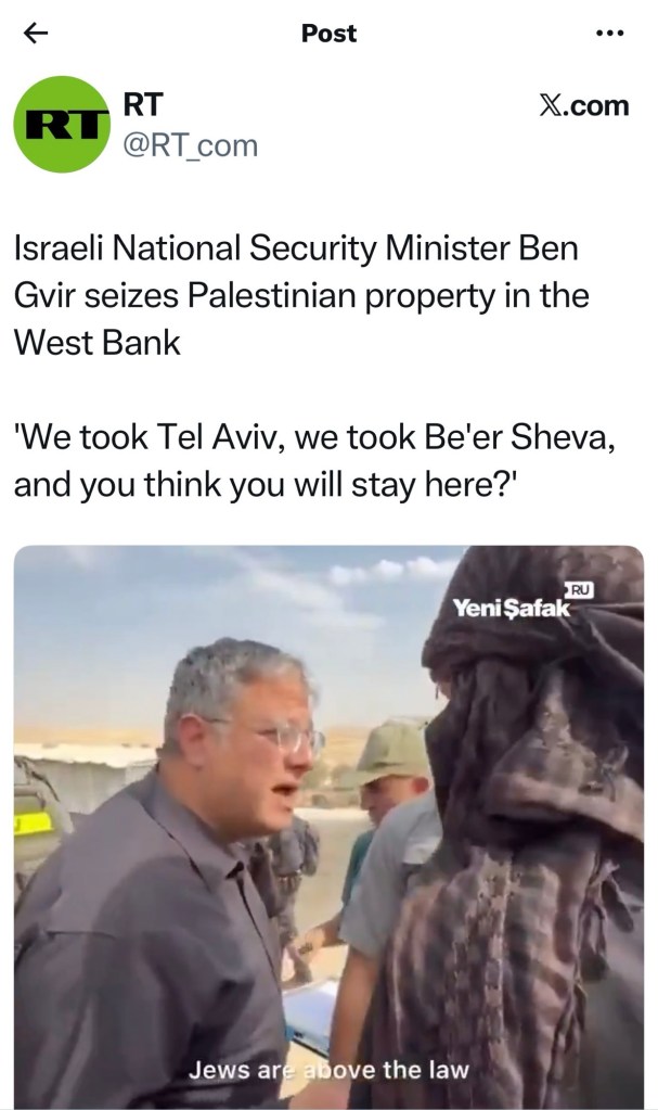 RT published a miscaptioned video of Israel’s Minister of National Security seizing an illegally built home and characterizing it as “seizing Palestinian property.”