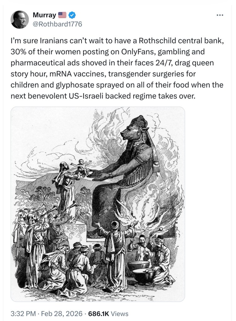 “I’m sure Iranians can’t wait to have a Rothschild central bank, 30% of their women posting on OnlyFans, gambling and pharmaceutical ads shoved in their faces 24/7, drag queen story hour, mRNA vaccines, transgender surgeries for children and glyphosate sprayed on all of their food when the next benevolent US-Israeli backed regime takes over.” – @ Rothbard1776, 2/28/2026 https://x.com/rothbard1776/status/2027844391025467465?s=46