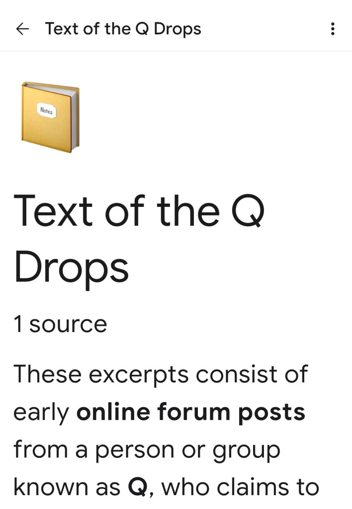 Download the Q drops. Create a Google notebook (NotebookLM). Upload the PDF. Ask for a summary on any topic. https://dannielleblumenthal.com/2026/03/09/download-all-the-q-drops-in-pdf-form/