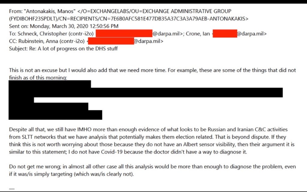 In 2020, Professor Manos Antonakakis, a top researcher working with DARPA, confirmed in a private email that evidence of Russian and Iranian Command and Control (C&C) activity inside state and local networks was “beyond dispute.”
