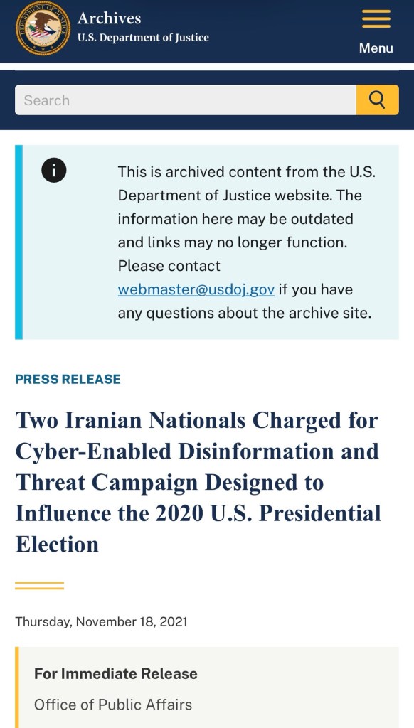- Two Iranian Nationals Charged for Cyber-Enabled Disinformation and Threat Campaign Designed to Influence the 2020 U.S. Presidential Election https://www.justice.gov/archives/opa/pr/two-iranian-nationals-charged-cyber-enabled-disinformation-and-threat-campaign-designed