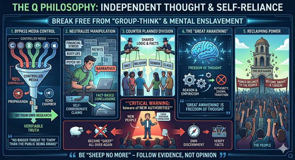 According to the teachings of Q, thinking for yourself and conducting your own research is the only way for the public to break free from mental enslavement.