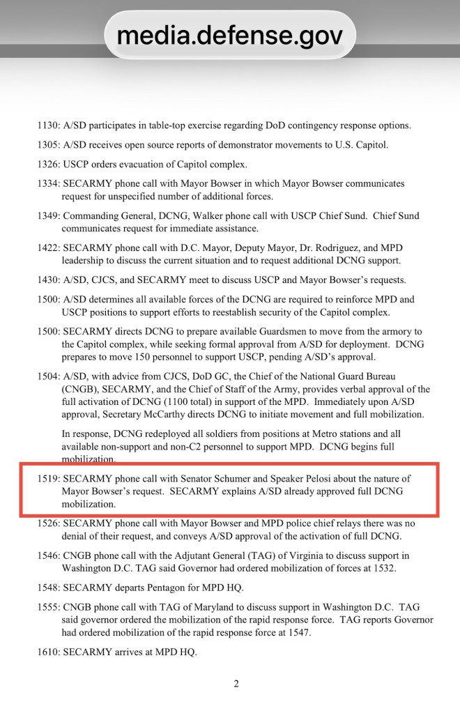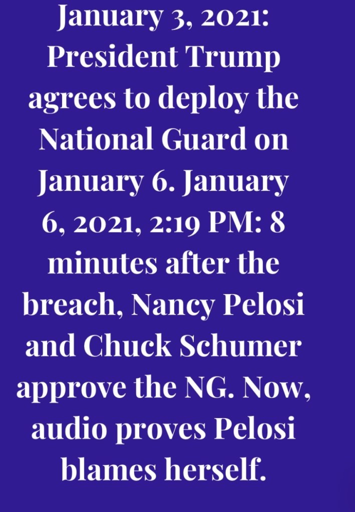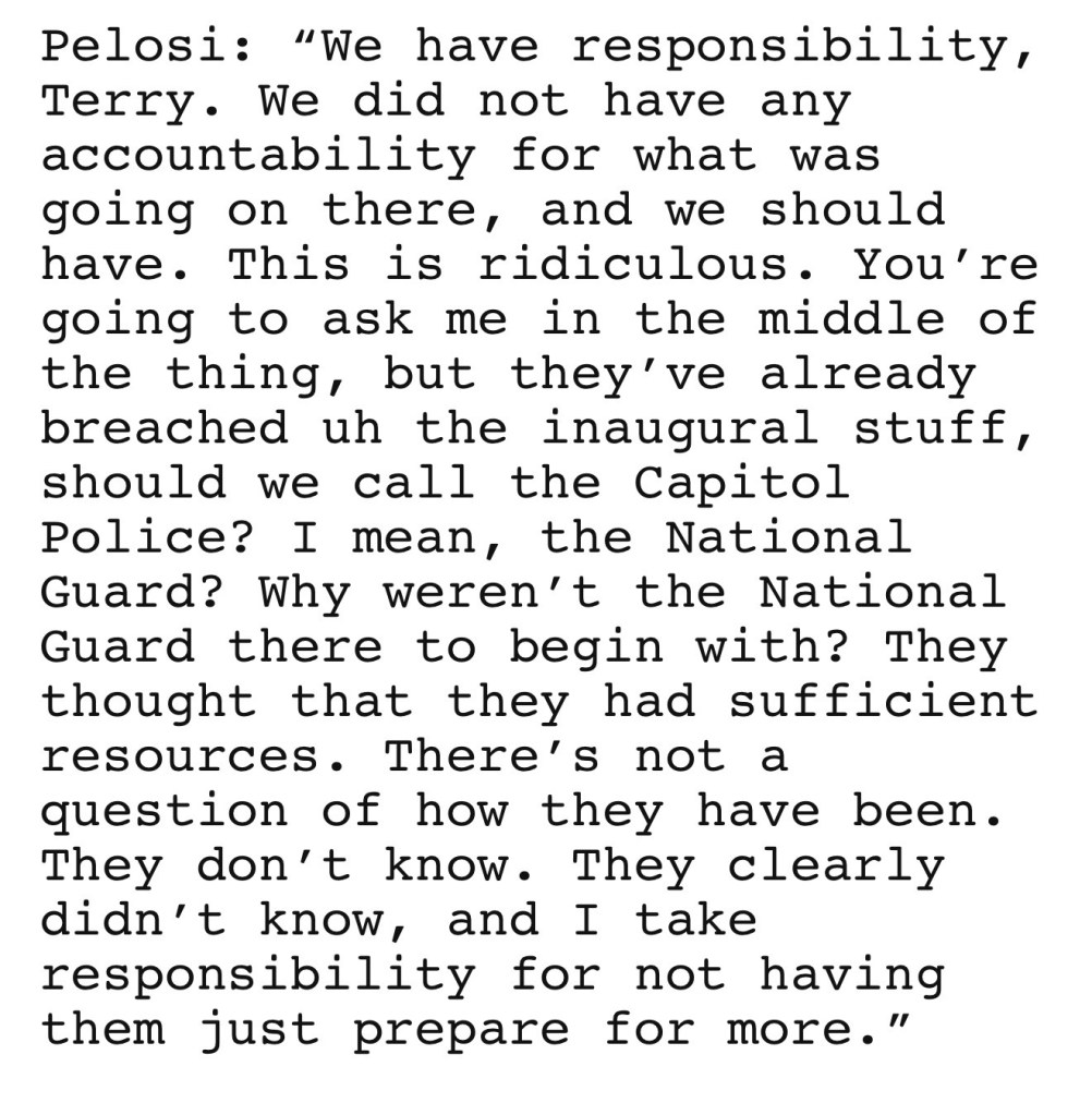 Pelosi: “We have responsibility, Terry. We did not have any accountability for what was going on there, and we should have. This is ridiculous. You’re going to ask me in the middle of the thing, but they’ve already breached uh the inaugural stuff, should we call the Capitol Police? I mean, the National Guard? Why weren’t the National Guard there to begin with? They thought that they had sufficient resources. There’s not a question of how they have been. They don’t know. They clearly didn’t know, and I take responsibility for not having them just prepare for more.”