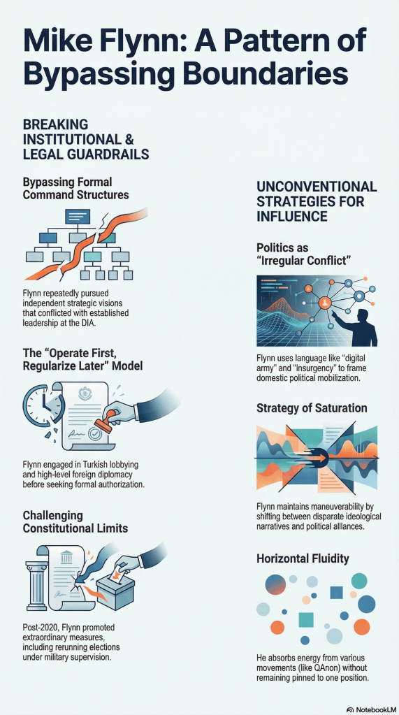 Across that career, Flynn exhibits a consistent throughline: a drive not just to influence decisions, but to expand his authority beyond the limits set by superiors, institutions, or formal roles. At the DIA, this tendency brought him into sustained conflict with leadership. His early removal in 2014 followed concerns that he was pursuing his own strategic vision rather than functioning within established command structures. This was not simply stylistic friction. It raised a deeper issue: whether Flynn saw institutional constraint as something to work within—or something to work around.