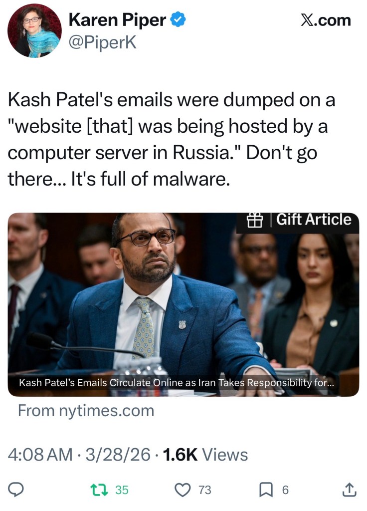 Now we learn Russia is waiting for all the curious seekers of Kash’s information, with lots of malware ready. https://www.nytimes.com/2026/03/27/us/fbi-director-kash-patel-hacked-email-iran.html?smid=url-share