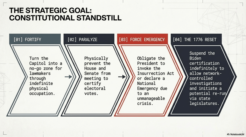 - The Occupation: Under the “Alcatraz Strategy,” a group of people would take over the Capitol and refuse to leave. This would turn the building into a “no-go zone” for lawmakers, creating a “Constitutional Standstill.”
