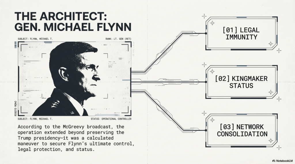 The operation allegedly failed due to internal leaks, specifically by General William J. Walker, prompting Flynn to “cut and run” to protect his own interests. This abandonment left those on the ground without support and shifted the political and legal fallout onto President Trump.