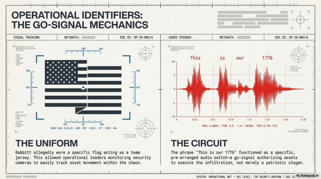 - Operational Identification: To ensure she could be identified by the operation’s managers on camera, Babbitt allegedly wore a specific flag like a “team jersey.”