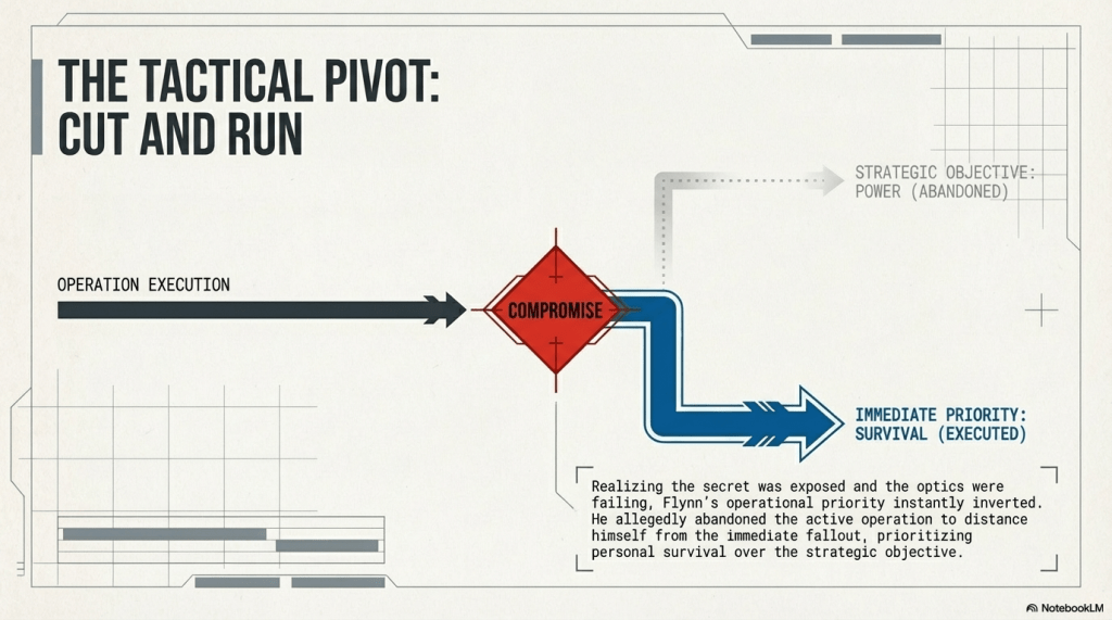 - Flynn’s Retreat: Upon realizing the plan was compromised, Flynn allegedly abandoned the operation to save himself.