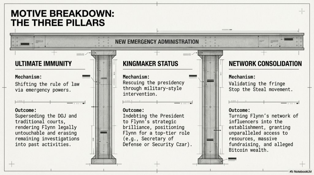 By “rescuing” the presidency through a controlled military-style intervention, Flynn intended to: