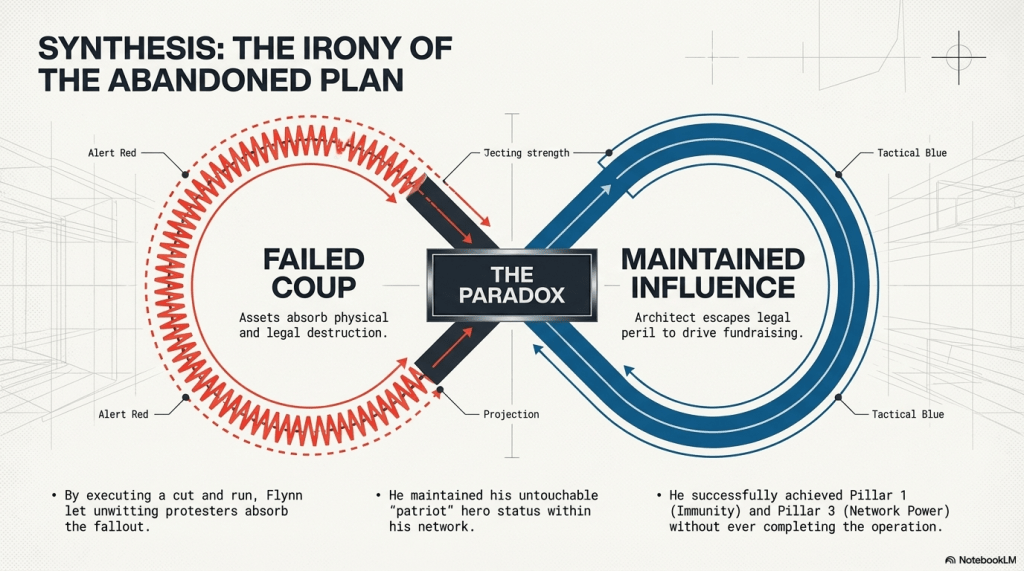 - Status Quo Preservation: This retreat allowed Flynn to continue his public influence and fundraising activities without facing the legal consequences of a failed coup.