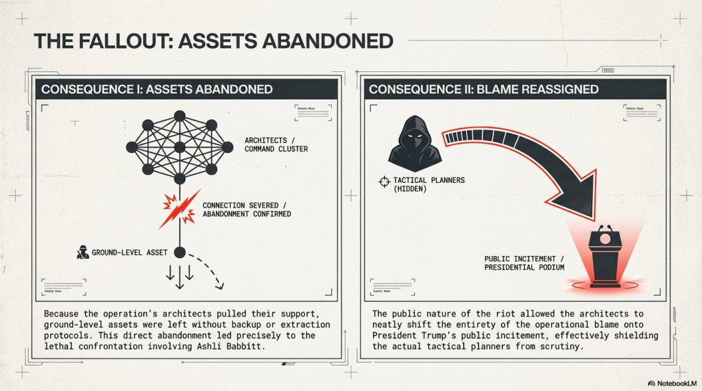 - Abandonment of Assets: Protesters and assets like Ashli Babbitt were left without the promised backup, leading to Babbitt’s death.