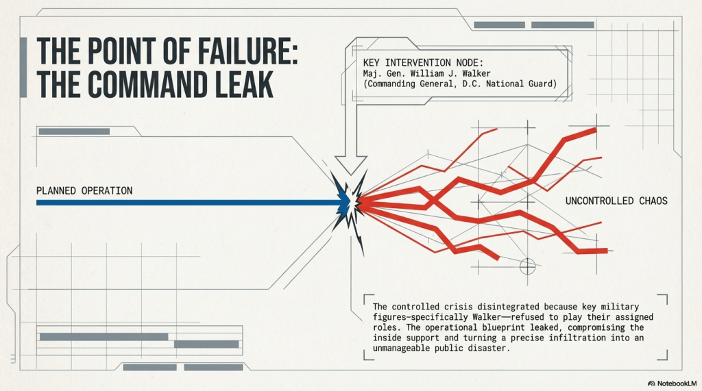 - The Leak: The plan reportedly fell apart when details were leaked. General William J. Walker (D.C. National Guard) is identified as a key figure who did not play his assigned role, causing the “controlled” crisis to devolve into an “uncontrolled” riot.