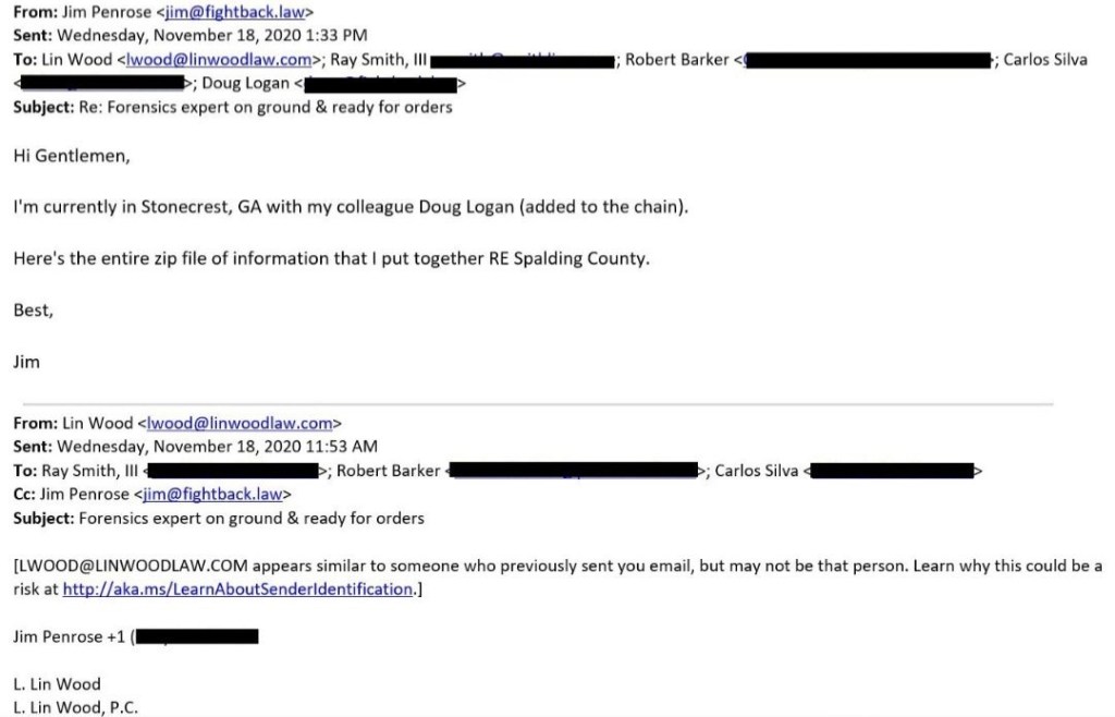 “Former NSA cyberhacker Jim Penrose (who tried but FAILED to manufacture evidence to use to secure a FISA warrant to gain access to the Maricopa County Election Center in Arizona–for access to voting machines and paper ballots– by first attempting to exploit me via an inchoate fraudulent scheme advancing a fabricated story pushed by their team asset Kenneth Scott Koch on or around November 17, 2020, then the first week of December 2020, successfully with the support of the First Amendment Praetorian (“1AP”) team, gained access to voting machines in a hotel room with a towel stuffed under the door in Antrim County, MI, and then FAILED, but attempted, to again exploit me to assist in gaining access to Maricopa County voting machines through a subpoena in my case in a similar way that he obtained access in Michigan through Matt DePerno’s case but I REFUSED to issue the requested subpoena to the Court on December 12, 2020, then on January 7, 2021, again obtained access to voting machines in Coffee County, GA). Penrose was directly and actively involved in the elaborate and sophisticated witness tampering efforts (that involved kidnapping, armed robbery, and abuse of a vulnerable adult) to conceal he and his team’s role and involvement in the attempted but failed efforts to gain such access to voting machines. Jim Penrose was also part of the fusion team at Lin Wood’s Tomotley ranch in November and December 2020 when these events took place (see below)…