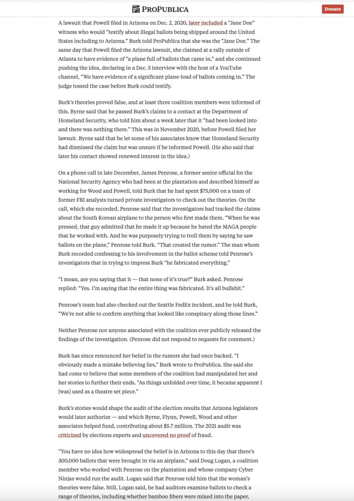 Note: The attached excerpt of an article by@ProPublicais entirely inaccurate and repeats falsehoods perpetrated by Jim Penrose and the 1AP team as part of those witness tampering and public narrative influence efforts. @DougBockClark and @AlexandraBerzon knew that the “story” and theories were told to me to begin with by Trump campaign attorney Brandon Paroly. They knew this at the time of publication because that call was audio recorded and provided to them nearly eight months before they published this story. And I said I believed I was the Jane Doe witness based on what I was being gaslit to believe at the time by one of the 1AP team members James Curtis, who was in frequent contact with Doug Clark and quite influential in shaping this story and providing background information on the Antrim County efforts described above and misdirecting via witness tampering the Maricopa County efforts. The actual “Jane Doe” witness was Sabrina Keliikoa, a fact that @DougBockClark and @AlexandraBerzon were also well aware of because they had her identity and proof of her role signing the affidavit obtained by Jim Penrose from her the day before Powell listed her as a witness aligned with the claims Penrose made about securing the affidavit from her on the same audio recording they quoted Penrose from. @jordangreennc correctly reported Powell’s “Jane Doe” [aka Sabrina Keliikoa] and her role in his piece here (which also includes discussion of Penrose and related allies); alternet.org/alternet-exclu… To be clear… as of 2024 Kellikoa from the prior link still believes that she witnessed ballot fraud, Biden was never inaugurated, that Trump remained President during Biden’s term and she will one day testify in support of Powell’s election fraud claims. In addition, Penrose’s lies regarding the “findings” of the Sky Harbor airport investigation upon further inquiry were entirely fabricated because according to the family owned (at the time but has since been sold) Swift Aviation, there was no “baggage handler trolling MAGA coworkers.” All of the employees at Swift Aviation were avid Trump supporters. The initial “source” of the report from Swift Aviation was Oprah’s private pilot, Don Johnson, who himself is an avid Trump supporter and friend of Charlie Kirk. Here is @ProPublica’s inaccurate piece (related inaccurate excerpt below) that they have never corrected despite repeated requests to do so; propublica.org/article/big-li…” – Staci Burk, 4/18/2026, https://x.com/staciburk/status/2045363944165183787?s=46 (archive link https://archive.is/2026.04.18-102148/https://x.com/staciburk/status/2045363944165183787?s=46)