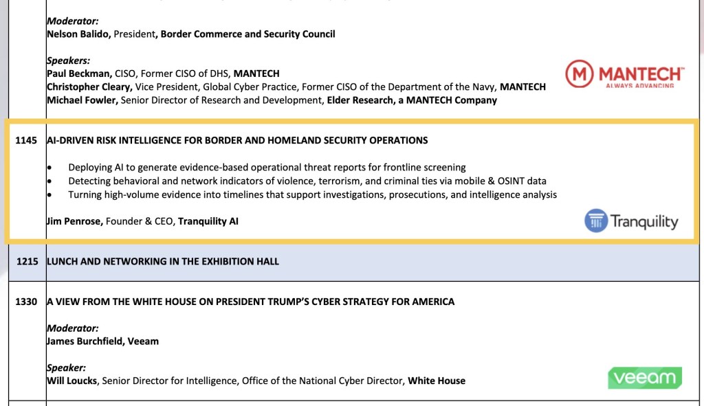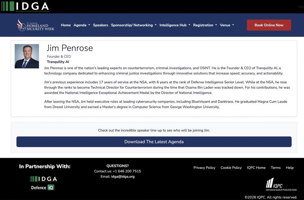 I find it quite fascinating that Jim Penrose just two weeks ago spoke at a National Security Conference, on the topic of, “detecting behavioral and network indicators of violence, terrorism, and criminal ties via mobile & OSINT data.”