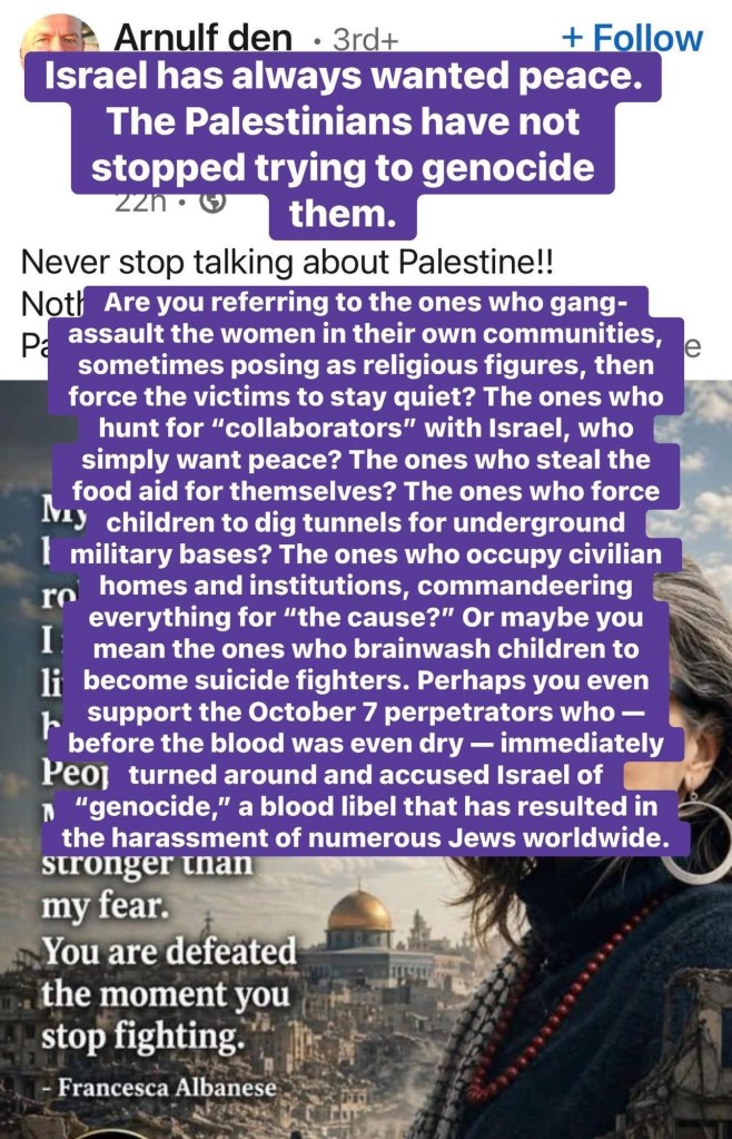 Sharing an online conversation. To the person who said “never stop talking about Palestine” I asked: Are you referring to the ones who gang-assault the women in their own communities, sometimes posing as religious figures, then force the victims to stay quiet? The ones who hunt for “collaborators” with Israel, who simply want peace? The ones who steal the food aid for themselves? The ones who force children to dig tunnels for underground military bases? The ones who occupy civilian homes and institutions, commandeering everything for “the cause?” Or maybe you mean the ones who brainwash children to become suicide fighters. Perhaps you even support the October 7 perpetrators who — before the blood was even dry — immediately turned around and accused Israel of “genocide,” a blood libel that has resulted in the harassment of numerous Jews worldwide. Israel has always wanted peace. The Palestinians have not stopped trying to genocide them.