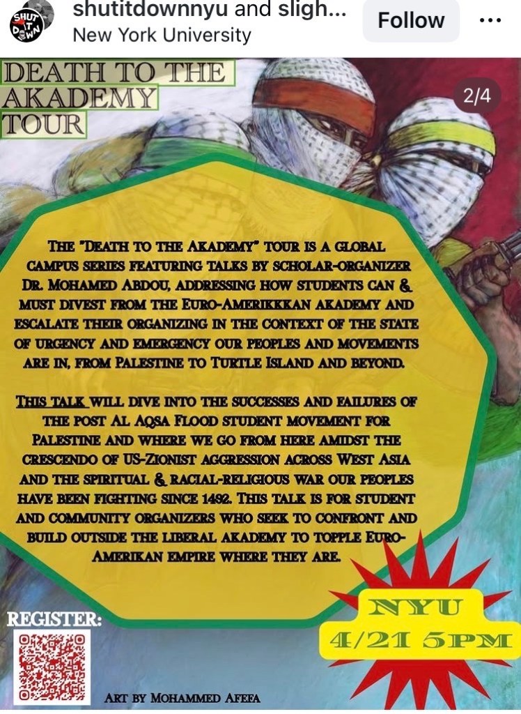 Some people think they’re doing their children a favor by sending them to very fancy colleges where they are indoctrinated by terrorists who love bomb them and then who indoctrinate them into a cult of hatred for the United States of overthrowing the United States. Well the result is happening tonight April 21st when Mohammed Abdu, okay, who glorifies terrorism, is speaking at NYU at an event where all the participants must be masked because the purpose of the event is to talk about how the United States should be overthrown. This is intolerable.